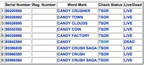 It’s interesting that King does not own a single U.S. trademark registration for a CANDY-formative mark, especially given their rather aggressive enforcement policy — here are their USPTO “Candy” filings: