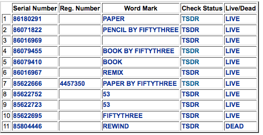 Which probably explains why FiftyThree initially filed to register PAPER BY FIFTYTHREE instead of PAPER on its own. Here are FiftyThree’s USPTO filings: