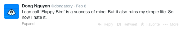 “Flappy Bird was designed to play in a few minutes when you are relaxed … But it happened to become an addictive product. I think it has become a problem. To solve that problem, it’s best to take down Flappy Bird. It’s gone forever.”