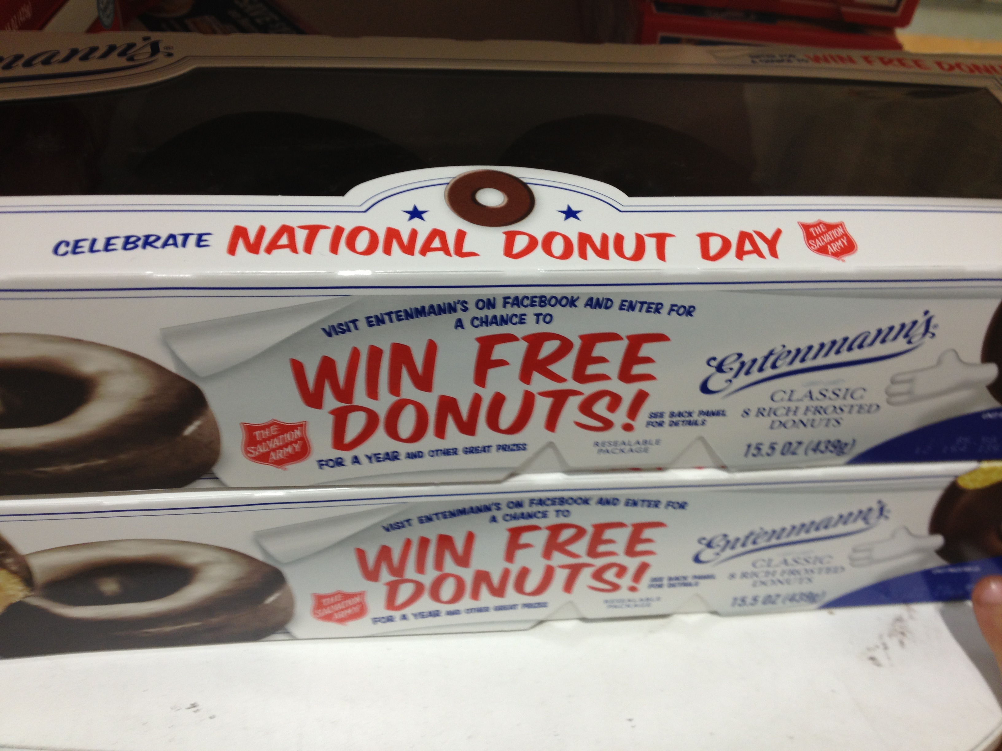 Notice The Salvation Army name and logo on the packaging and poster. The Salvation Army’s website explains its interesting and lengthy history with donuts and its creation of “National Donut Day” in 1938: